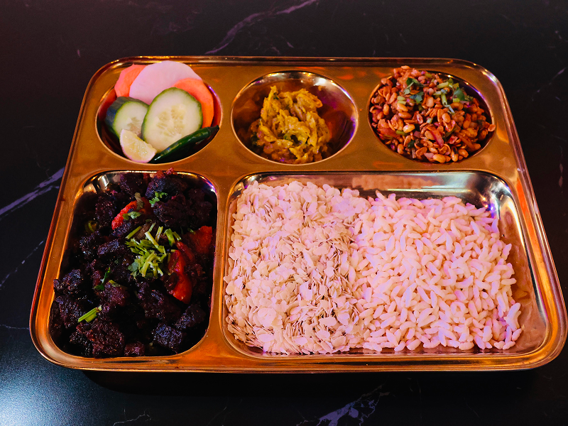 A wholesome platter of authentic Nepali flavors featuring fragrant steamed rice finished with pure ghee, comforting lentil dal, seasonal greens, and a selection of carefully spiced curries. Served with fresh salad, tangy achar, and crispy papad, this thali offers a perfectly balanced and nourishing taste of Nepal’s culinary tradition.